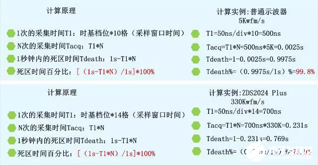 死区时间(处理时间):是示波器对采样存储回来的数字信号进行测量运算,显示等处理的过程。死区时间内示波器不进行采集。