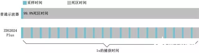 数据采集过程和数据信号处理的过程属于串行关系,无法同时时进行运作,也就是采集过程无法实时的处理数据,所以若波形刷新率低,则在信号采集过程中可能导致漏掉关键的异常信号,给调试工程师一个错误的判断,无法将故障检测出来,大大延长调试时间,降低调试效率。死区时间是数字示波器与生俱来的缺陷,没有办法消除,但是可以尽量的减小。