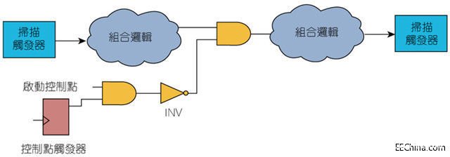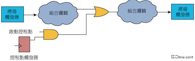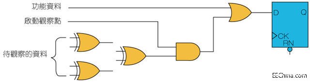 观察点让设计中难以观察的节点易于被某些扫描触发器观察到。当要观察设计中的多个节点时,将这些节点进行互斥或(XOR)处理,并馈送到扫描触发器。图5是处理这种观察点的建置。