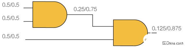图2表示当组合深度+1时,在不同节点得到“0”或“1”值的机率。在此组合区块中的输出得到“1”的机率为1/8。然而,这仍然是一个非常简单的组合区块,在实际设计中所看到的区块更复杂。因此,随着组合深度的增加,控制节点于特定值的能力随之减弱。