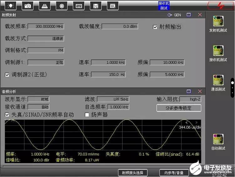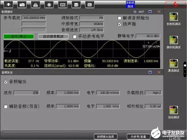 有时我们只想测试电台的某方面性能,并且想仔细观测相关指标和波形,这个时候就需要用到专用的发射机测试功能和接收机测试功能。AV4945B/C提供了电台测试专用发射机和接收机测试功能,发射机测试功能提供音频输出和射频分析,接收机测试功能提供射频输出和音频分析,指标详细,图象清晰,测试结果直观。