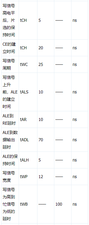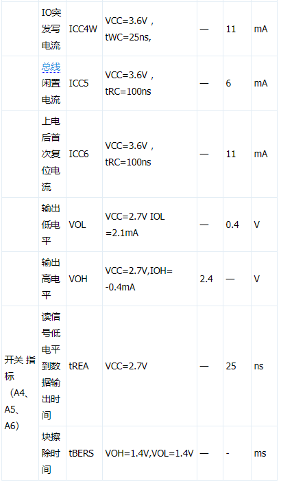 针对NAND FLASH类存储器件,其电性测试内容主要有管脚连通性测试(continuity)、管脚漏电流测试(leakage),电源管脚静态电流测试(ICC1/ ICC2)、电源管脚动态电流测试(ICC3)、输出高/低电平测试(voh/vol),时序参数测试(TACC、TOE、TCE)。