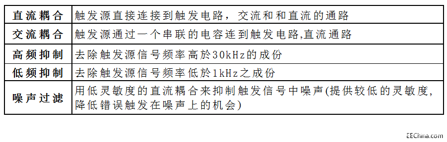 下表给出了一种示波器的触发偶合的方式和作用,其他种类不尽相同。注意触发耦合与垂直通道偶合有本质区别,垂直耦合将影响到被测波形。