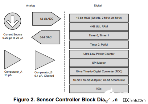 SimpleLink传感器控制器是专用的16位中央处理单元(CPU)核心,在活动模式、待机模式和启动耗能阶段均只消耗极低功率。如图 2 所示,该传感器控制器包括模拟和数字外围设备,它们专为实现超低功率而进行了优化。
