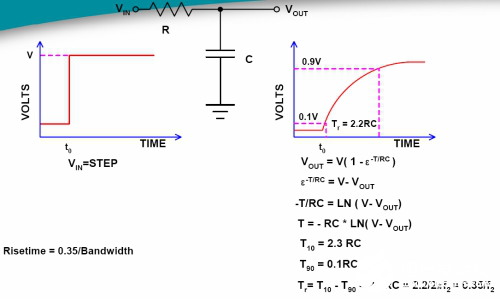 从以上电路中我们了解到带宽f2即输出电压降低到输入电压70.7%时的频率点。根据放大器的等效模型,我们可进一步推导示波器的上升时间和带宽的关系式,即我们常提到的0.35的关系:上升时间=0.35/带宽,推导过程如下图6所示。需要说明的是,0.35是基于高斯响应的理论值,实际测量系统中这个数值往往介于0.35-0.45之间。在示波器的datasheet上都会标明“上升时间”指标。示波器测量出来的上升时间与真实的上升时间之间存在下面的关系式。在对快沿信号测试中,需要通过该关系式来修正实际被测信号的上升时间。