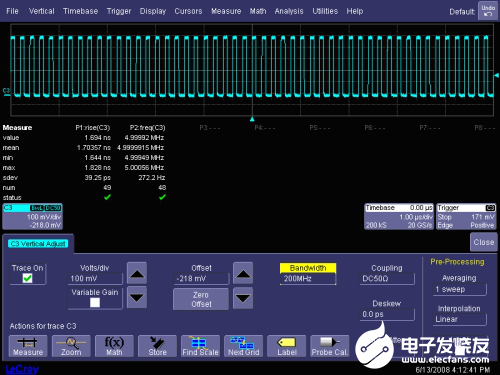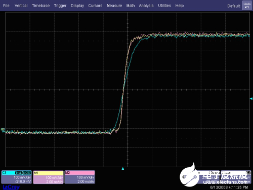 3、使信号的相位失真。那么,“对于5MHz的时钟信号,需要用多少带宽的示波器来测量”?很多人都回答的不是严谨,因为很少有工程师反问我:“这5MHz的时钟信号是方波还是正弦波,如果是方波,其上升时间是多少”。我常得到的回答:“100MHz带宽就足够了,示波器带宽通常是被测信号频率的3-5倍,100MHz余量很大了。”图13显示了5MHz的方波信号在不同带宽时测试出的波形。其中,M1和M2是分别在6GHz和1GHz时波形,C3是带宽限制到200MHz的测试结果。图14显示在带宽限制到200MHz时测量出的5MHz的上升时间均值为本1.70357ns,而图15显示的是在6GHz带宽时的上升时间为873.87ps。这表明,对于5MHz的时钟,因为其上升时间比较快,最好用1GHz以上带宽的示波器来测量其上升时间,200MHz时其上升沿变缓;1GHz带宽和6GHz带宽对于测试800ps的上升时间结果几乎一样。
