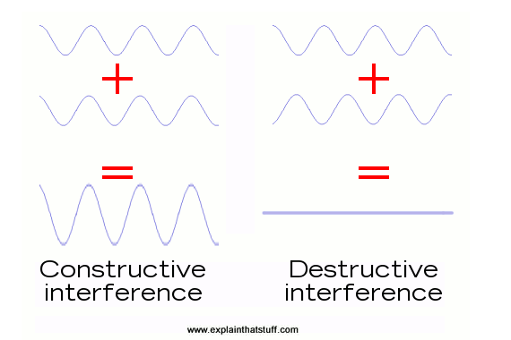 两种类型的干扰。 相长干涉意味着将两个或多个波组合起来以获得更大的第三波。新波具有相同的波长和频率,但振幅更大(峰值更高)。 破坏性干扰是指波相减并抵消。一波的峰值被另一波的波谷抵消。