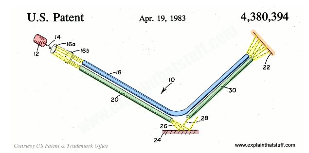 光纤干涉仪。大多数干涉仪通过露天的光束,但当地的温度和压力变化有时会成为误差的来源。激光(红色,12)通过透镜(灰色,16a/b)将其光束射入一对光纤电缆中。其中一条(蓝色,18)成为参考光束,将其光线直接反射到屏幕(橙色,22)上。另一个(绿色,20)允许其光束从被测量的东西(如振动表面)反射到第三条电缆(绿色,30)。参考光束和反射光束相遇,并以通常的方式在屏幕上进行干涉。作品由美国专利商标局提供。