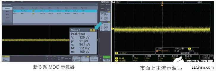 图2 泰克新MDO3系示波器和传统示波器本底噪声对比