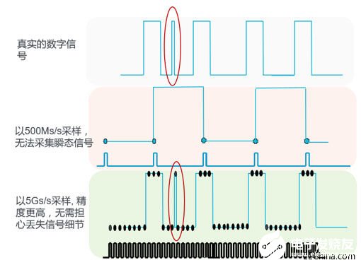 由图6可以看出,对于现在越来越快的数字信号调试,需要更高的采样速率捕获数字信号细节,如果采样率不够就如图6所示丢失掉信号的细节,甚至还原完全错误的信息,当然更无法捕获快速的异常信号。