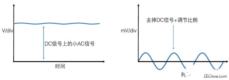 在DC 偏置上测量低电压信号最简单的技术是使用参考地电平的探头采集整个信号,然后测量AC 分量 (图9 左图)。DC 偏置技术不允许AC 信号测量全面利用测量系统的动态范围,信噪比会很差。