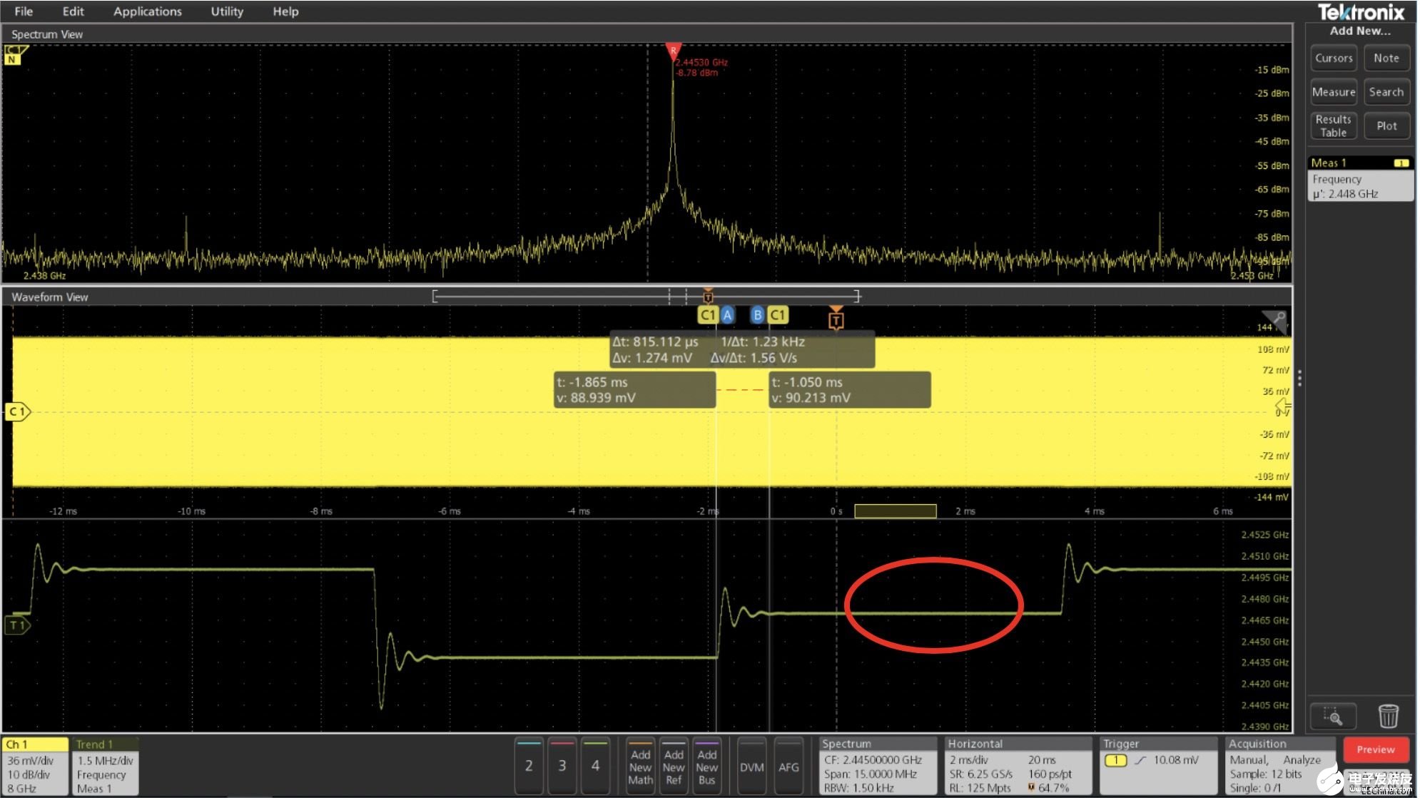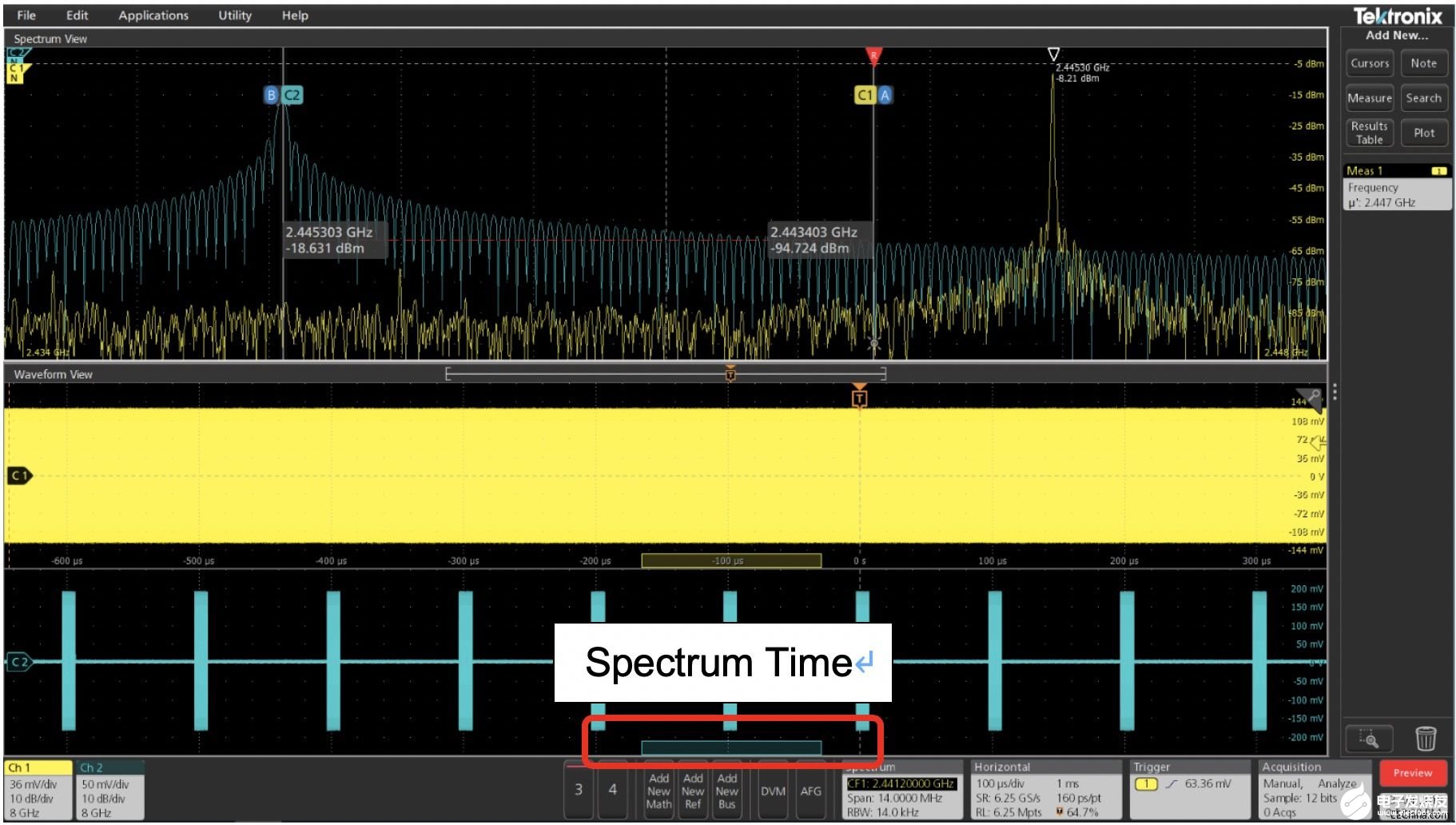 如前文所述,Spectrum View支持滑动Spectrum Time的位置,对不同时段的信号作频谱测试,这使得对信号进行多域联动测试成为可能。