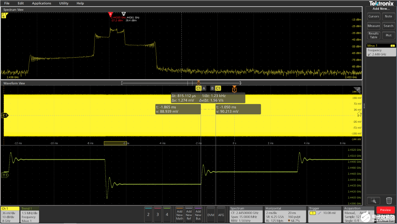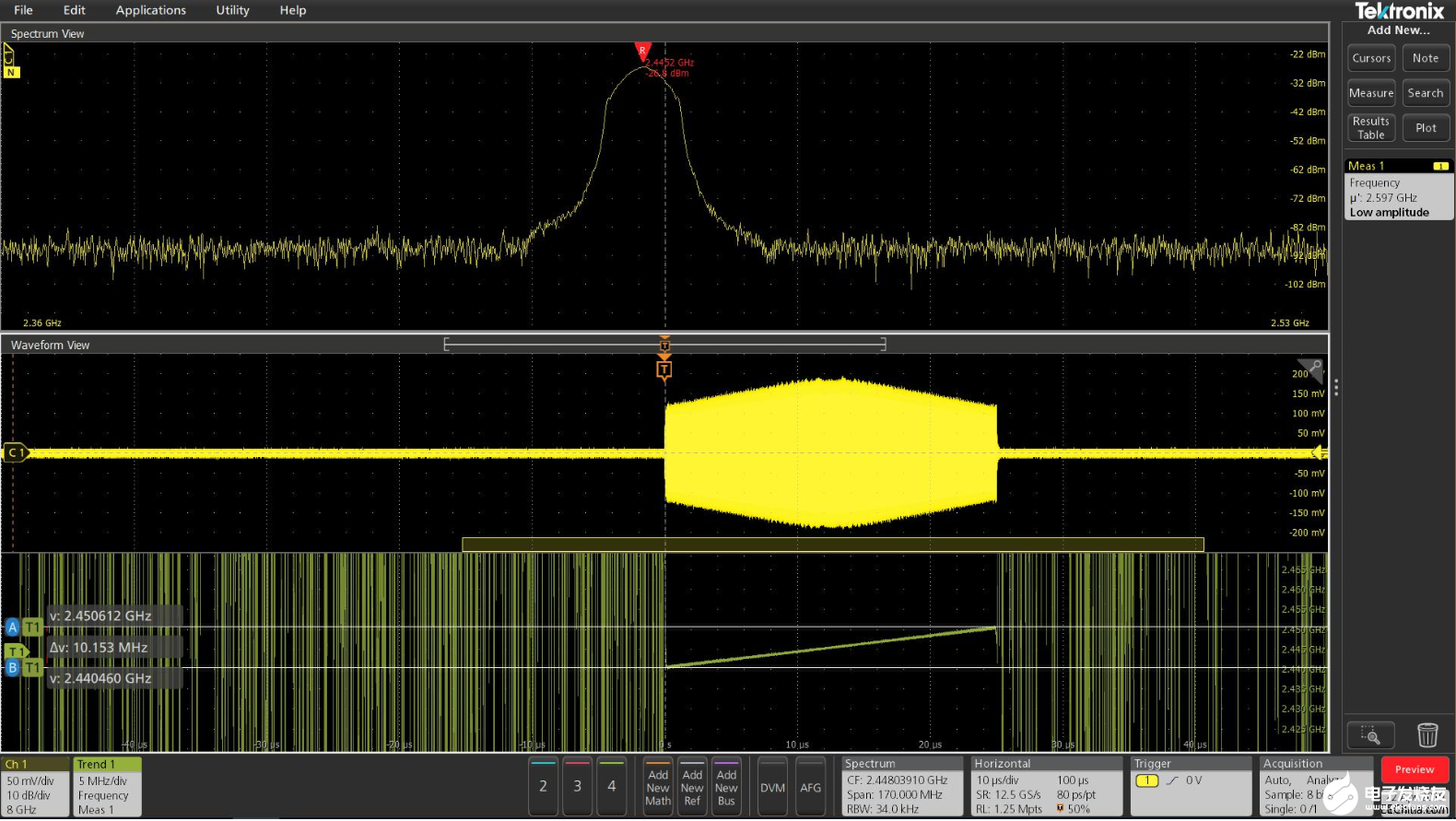本例实测了一个chirp pulse,时域参数可以使用示波器进行测试,频谱可以在Spectrum View中测试。Chirp pulse的调制域参数——调频曲线,则可以使用Frequency Time Trend测试,而且由调频曲线可以推导出chirp rate及linearity。