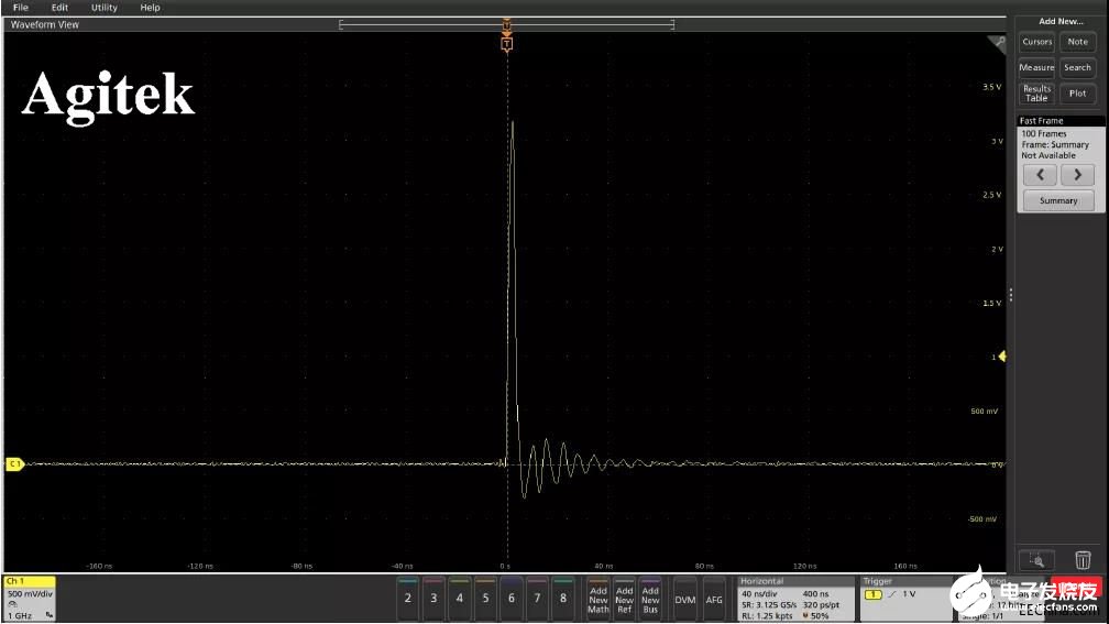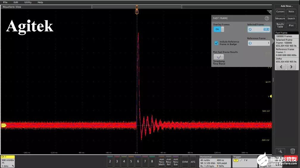 FastFrame采集模式的触发速率可以达到每秒500万帧(采集/秒),这比示波器其他的触发速率都要快得多。