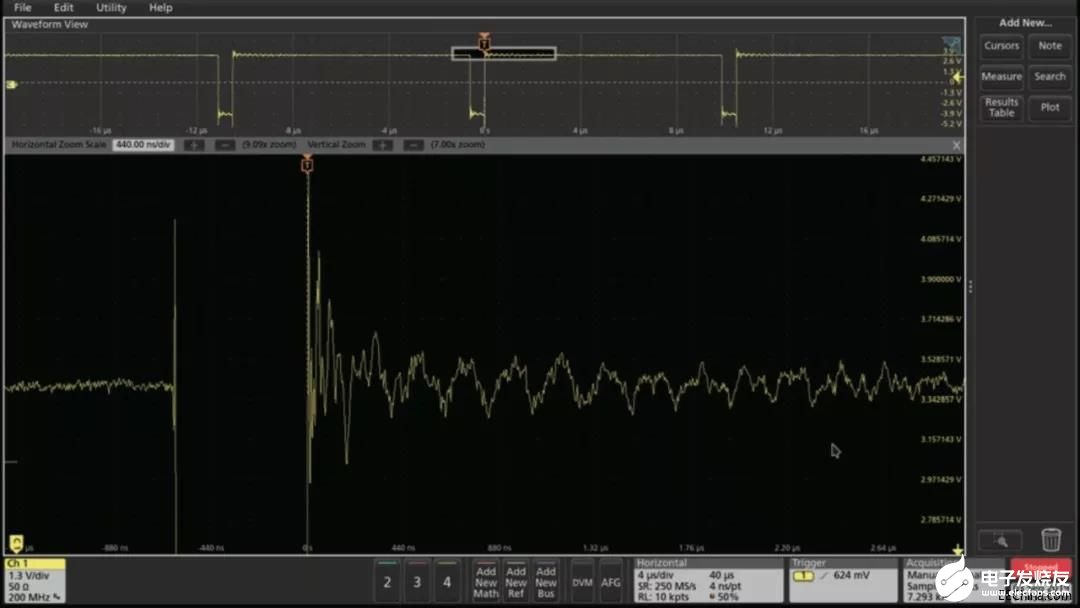在开关器件系统调试中,工程师会比较关注开关边沿的震荡信号,这需要示波器在保证垂直方向满足大量程的情况下,同时具备足够的分辨率保证能够捕捉到窄幅震荡信号的细节。
