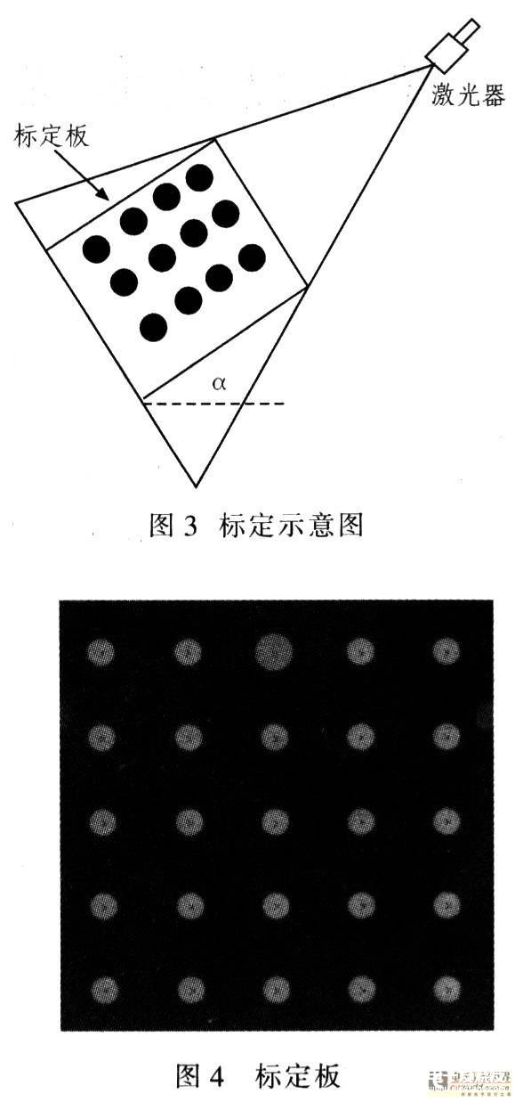 摄像机标定是指由世界坐标系中标定点以及对应图像像素坐标导出摄像机矩阵,并估计摄像机的内部参数。由于无论钢板厚度如何变化,钢板始终和激光面有条交线,即钢板宽度方向。与z轴方向无关,因此使用平面标定,如图3所示。将标定板(图4)放在激光面上,以垂直于标定板的方向为z轴,以平行和垂直于钢板宽度的方向在标定板上建立平面直角坐标系。选取圆的中心为标定点,两个相邻圆心之间的距离是16 mm,根据选取的坐标系,这些标定点在激光面上的位置是已知的,通过获取其对应的图像坐标确定摄像机的12个内外参数,从而完成标定工作。
