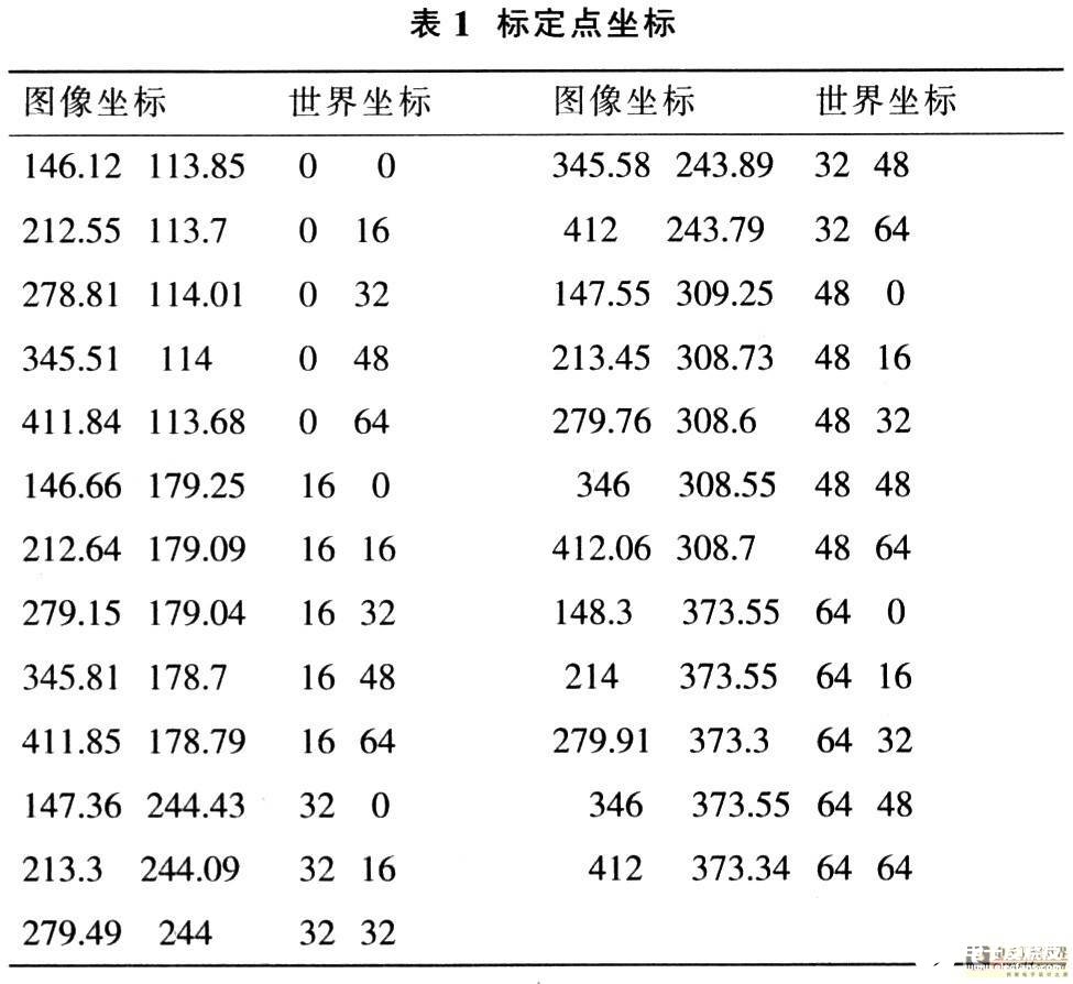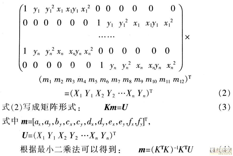 由一组已知的世界坐标系的点以及对应在图像坐标系的点可以确定两个方程,因此,要确定摄像机的内外参数,需至少知道6组这样的点,而所采用的靶标可以提供充足的特征点,利用最小二乘法确定各个摄像机的内外参数。从透影的角度看,图像坐标与世界坐标一定存在某种关系。由应用光学理论可知,在完全理想的情况下,图像坐标(x,y)和世界坐标(X,Y,Z)(假设Z=0)应是比例关系。然而由于存在畸变,以及CCD摄像机安装的误差(与光轴不垂直),使这一比例关系发生改变,而导致它们存在非线性关系。这一对应关系根据精度要求的不同可采用不同的模型描述,根据问题的实际情况,用二元二次多项式简化模型就可精确描述,建立的数学模型如下: