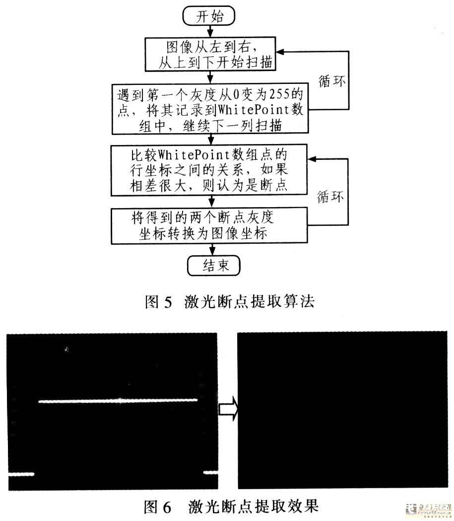 首先扫描图像像素,从左到右逐列扫描,提取所有激光线上的第1个白点,将其存到数组中,然后前后对比数组中的数据,如果发现行之间跳动很大,则认为是断点。图6是得到的激光断点效果图。