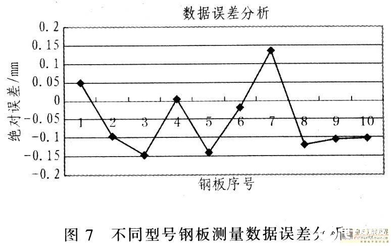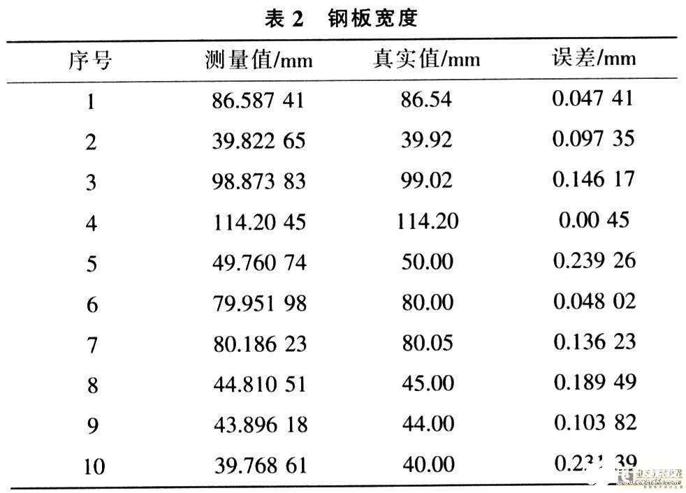 由于系统在激光面上进行标定,因此可不必考虑钢板厚度变化对结果造成的影响。又由于钢板现场有凹槽的固定,不必考虑钢板倾斜的影响。为验证实验结果,采用10种不同的钢板,分别测量,得到表2所示的数据。
