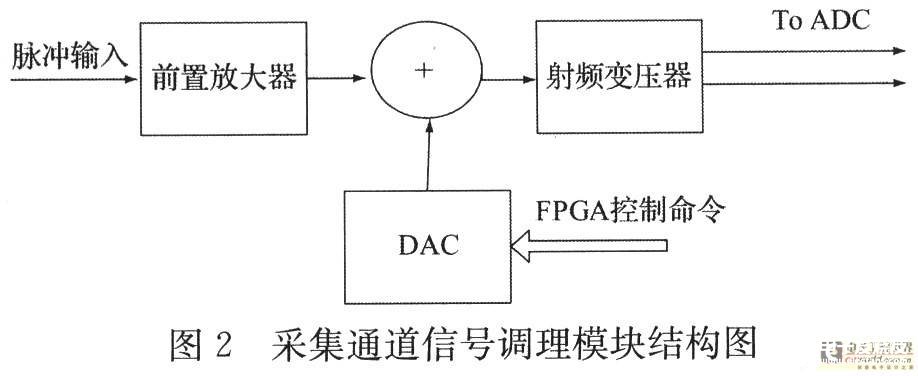 在气体行业检测的应用中,飞行时间质谱仪器中离子探测器的输出信号一般为NIM信号,幅值在0~-100mv,而超过此范围的大信号通常为H2O+及OH+等饱和信号,对测量结果影响不大,故不予考虑。由于输入信号幅度较小,为提高测量测量精度并充分利用ADC的量化范围(650mV),设计中在采集通道的信号调理模块利用微波管Mini ERA_1+完成前置放大。ERA_1+的3dB带宽为DC~8GHz,内部与50欧传输线匹配,最大增益12dB。同时,由于ADC08D1500要求差分输入,故信号调理模块在前置放大后利用射频变压器Mini ADTL2_18完成单端信号到差分信号的转换。图2所示为采集通道信号调理模块结构图。