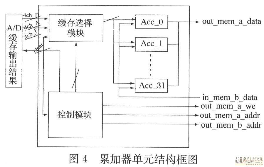 A/D采样缓存单元控制外部A/D芯片,并实现内部定时,每50us启动一次数据采集,每次数据采集持续时间20μs。并将采样数据存放在一深度为4的缓存中,缓存中的数据由累加器单元进行后续处理。