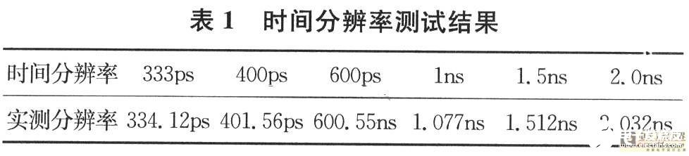 本设计中射频采集部分的采样时钟为1.5GHz,故在交错采样模式下,ADC的采样率为3GSPS。因而ADC的采样间隔为1/3GSPS=333ps,即时间间隔大于333ps的信号即可为系统所分辨,测量。实际测试中采用延迟线测量法进行时间分辨率的测试。时间分辨率测试数据如表1所示。