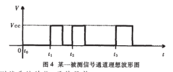如图2所示,在炮弹爆炸瞬间,绕在炮弹上的触发线立刻被炸断,触发线电平立即上升为Vtrg,Vtrg为一直流正电平,作触发电平用,其值应小于Vcc。从而触发数据采集卡,启动采集,开始记录靶上信号线的输出波形,波形起点即为炮弹爆炸时刻t0。继续记录靶上信号线输出波形,根据其波形特点,即可确定各弹片的入靶时刻ti。如图3所示,弹片未入靶时,高电平Vcc未与信号线相连,采集到的数据为0电平。Vcc为一直流正电平,当弹片入靶时,金属弹片把Vcc与信号线相连,采集到的数据跳变为Vcc电平。当弹片离靶后,信号线电平又回到0电平。因此,当多个弹片先后入靶时,同一弹洞系列的理想波形便应如图4所示。其中,t1、t2、t3分别为弹片1、弹片2、弹片3的入靶时刻。t0为触发时刻,即炮弹爆炸瞬间时刻。至此,炮弹爆炸时刻和各弹片入靶时刻均已准确测得,各弹片的平均飞行速率即可由公式