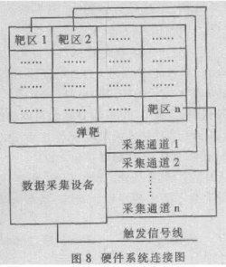 该系统的硬件连接如图8所示。其中每个靶区的电路图如图3所示,每个靶区采集的波形与图7所示波形相似,触发信号电路区如图2所示。显然,相邻靶区之间的间距不宜太大,以免漏测。但这样又会带来负面影响,即当靶区1有弹片入靶而靶区2没有弹片入靶时,靶区1将有LC振荡。由于共振,靶区2也会有同频振荡,只是振幅小一些。这种通道之间的相互干扰往往使人误认为在靶区1有弹片入靶的同一时刻,靶区2也有弹片入靶。由于靶区1和靶区2的靶距不一样,这样势必引起速率计算不准确。可以通过软件来消除这种假象。