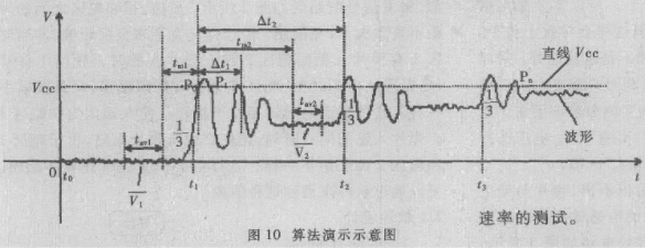 如前所述,由于LC振荡引起的通道间共振,将导致某个时刻本无弹片入靶的通道也会出现与该时刻有弹片入靶的通道相类似的波形。虽然无弹片入靶时通道的波形振幅比较小,但其振幅偶尔也会超过Vcc。为避免误以为有弹片入靶而导致的速率计算错误,可在下述算法中予以清除。如图10所示,对于每个弹片,从弹片入靶时的第一个交点起,向正时间方向平移时间tm2。从该时刻起,向正时间方向取tm2长的时间段求波形平均电平(如图10的),然后将该平均电平与该弹片入靶前的平均电平(如图10的)相比较。如果电平阶跃差大于某门限值,则认为该通道此时刻有弹片入靶;如果电平阶跃差小于此门限,则该通道此时刻无弹片入靶。这是因为,根据试验统计规律,某时间段内,受其他通道干扰而产生的通道波形,其电平阶跃差不会很大。这样就可以解决LC振荡引起通道间共振引起的误以为弹片入靶的计算错误。