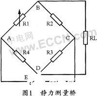 静力测量一般通过单桥或双桥桥式电路来实现,在图1所示的电桥中,在初始状态,桥是平衡的,也就是B、D两点的电压为0。而在力的作用之下,由于压力电阻的特殊属性,应力变化导致R1电阻阻值发生变化,从而使得桥臂不平衡,这个不平衡会反映在电阻R1的电压上。该电压再经过放大电路放大,最终作为AD转换器的输入电压信号。这里需要注意的重要一点是,电阻RL两端的电位均是以电源E的一半为参考的,因此,在电路设计时,这一点需要充分考虑。