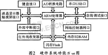 基于目标系统功能的要求,本设计中整个系统的核心处理器和操作系统分别选定三星公司基于ARM9内核的S3CFS2410处理器和目前比较流行的Linux操作系统。同时,其硬件系统还需具备处理能力和外设比较丰富的ARM处理器、适当大小的内存、存储容量匹配的闪存、显示设备和交互设备接口、串口和USB口、网络控制器和网口、模数转换模块、外部中断接口、红外线收发器、实时时钟和在线调试ICE接口等。其功能方框图如图2所示。