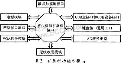 本设计在硬件实现方案上充分考虑到系统的可扩展性和核心板布局的灵活性,因而采用了拔插式的核心板布局。其他各外部功能处理模块(如键盘、模数转换电路、通用I/O口、液晶屏、触摸屏、网络接口、USB接口、无线收发模块、串口UART、VGA转化电路和电源模块)均采用扩展接口的形式来实现其模块功能,主要用来完成数据的收发、网络通讯、键盘操作以及图像处理和显示。通过这些特殊功能模块可对现场得到的数据进行特定的处理,以便很好地完成人机交互界面和通过外设对系统核心模块的控制,具体接口方式如图3所示。