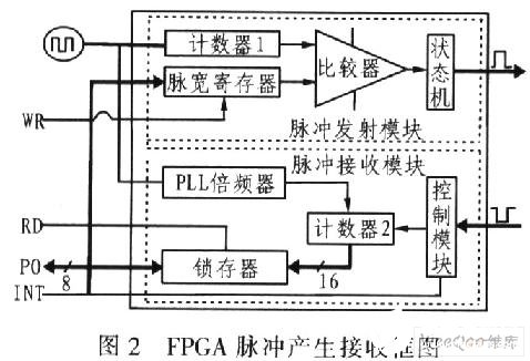 图2为FPGA脉冲产生接收框图。FPGA产生宽度可调的脉冲,按系统设计要求单片机向FPGA预置一个数,状态机处于低电平,在接收到单片机启动命令后,计数器1开始计数,与此同时状态机置高,每一个时钟脉冲沿到来时,计数器1值与预置数比较,直到两者相等,状态机才转为低电平,这样就发射一个脉冲。