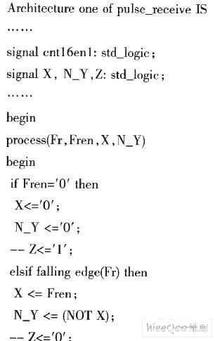 当接收到回波产生的第1个脉冲下降沿后。计数器2开始计数,直到第2个下降沿到来,计数器停止计数,计数值锁存后通知单片机已完成,单片机分两次高8位和低8位读取计数器值。计数器2通过锁相环倍频得到更高的采集时钟,以减小因采集计数所带来的测试误差。以下是捕捉这2个下降沿时,输出一个脉冲的VHDL 进程: