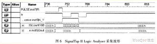 同时通过JTAG口从Quartus II的SignalTap II logic An-alyzer采集到的波形,如图6所示。由图6可知:脉冲在线缆中传播时间为260 ns,故断点位置在距测试端27.08 m处。测量300 m的网线得到网线长度为302 m。实际测量中由于元器件的性能以及线缆使回波脉宽变大,导致测试盲区并没有理论上的那样小。