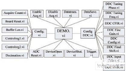 如图所示,按功能有两个高层应用子VI集合:Config.vi,Config DDC.vi,这两个子VI又分别调用低层组件子VI来完成特定的设置、配置任务。Config.vi完成采集卡的常规配置,例如对采集卡单次采集数量、FIFO满深度、寄存器(硬件通道、时钟、触发、采集方式、采集模式等的控制)设置、采集卡的状态查询等;Config DDC.vi完成DDC的所有配置工作,包括对DDC的模式、抽取率、输出格式、本振频率、本振相位、增益、CFIR滤波参数、PFIR滤波参数等的设置,从而实现DDC的数字IQ分离、抽取、数字滤波、重采样、多级增益调节、多种调制方式的解调等功能。其余低层组件VI实现设备的打开关闭、数据从数据采集卡到主机内存的传送、数据保存等。无论应用子VI或组件子VI均为独立可执行程序,实现特定功能,各VI函数作为提供给用户进行系统应用开发所需的各类操作。采用该结构,能够使用户在运行时修改虚拟仪器系统的运行逻辑与人机界面,可立即执行,因此在用户需要改变需求的情况下能迅速适配,数据采集卡具有可重构的特点,用户也不必去关心硬件的实现细节。