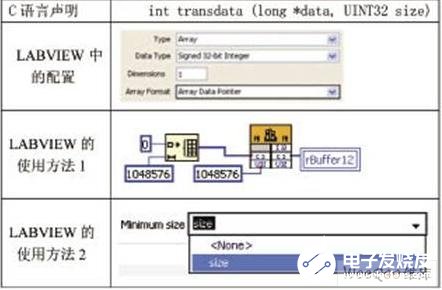 在LABVIEW中调用动态链接库,难点在于参数类型匹配。最常用的三种数据类型是:数值类型、字符串、数值型数组。设计中,将采集数据传送到内存块过程涉及到带数组参数的函数调用,值得注意的是,LABVIEW 只支持 C 数据类型中的数值型数组,调用含有数组参数函数时,传递数组类型“Array Format”要选择“Array Data Pointer”。这个设置中还有其他两个选项(Array Handle,Array Handle Pointer),这种带有“Handle”的参数类型都是表示LABVIEW定义的特殊类型的,在第三方的DLL中不会使用到。按前述步骤设置好CLF节点,连接外部输入(采集数量size)和输出(存放采集数据的数组)后,输出没有反应,检查分析得知,数组参数作为输出值时,要为输出的数组数据开辟空间,将输入数据的指针复制给输出数组数据指针并传给驱动函数。在LABVIEW中开辟数据空间的方法有两种:
