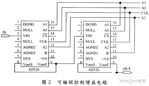 在本系统中,利用两片AD526和单片机AT—mega32设计了能够进行自动增益控制的放大器。AD526是美国AD公司生产的一款性能优良的软件可编程放大器,单片AD526的放大倍数是1,2,4,8和16,两片AD526级联后可获得32,64,128和256倍增益。由于输入模拟信号幅度大小的差异,有可能要求使用不同的放大倍数进行放大,以满足线性放大要求,则放大器的放大倍数需要实时控制,AD526能够满足这样的要求,它的放大倍数随时可以由一组数码控制。将从CD4501输入的现场信号根据要求自动调整到适合A/D转换的最佳输入范围,再启动AD574进行转换,能够有效地保证在低输入时的转换精度,扩大采集系统的动态范围。可编程控制增益电路如图2所示。