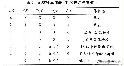 在本采集系统中,采用了AD574芯片0~+10V单极性输入方式,将它的第2引脚直接接地,则可实现12位高精度转换,转换结果分两次输出。AD574状态引脚STS接至单片机PC口的第3引脚,采用查询方式读取转换结果。当R/C=0时,启动A/D转换器进行模/数转换;经25μs后STS=1,表明A/D转换结束,此时将R/C置1,即从数据端读取数据,具体控制逻辑如表1所示。AD574与AVR单片机的接口电路如图3所示。