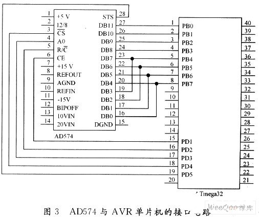 采用Ateml公司的AVR系列单片机ATmega32与AD574构成数据采集部分。ATmega32是一款高性能、低功耗的8位AVR微调理器,先进的RISC结构,具有32 KB的系统内可编程FLASH。AD574是美国AD公司研制的12位逐次逼近型模数转换器,具有外接元件少、功耗低和精度高等特点,它的转换速度为25μs,转换精度为O.05%,输入的模拟电压可以是单极性也可以是双极性,内部集成转换时钟,可广泛应用在数据采集系统中。由于AD574芯片内有三态输出缓冲电路,因而可直接与单片机的数据总线相连,而无须附加逻辑接口电路。