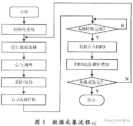 数据采集系统的软件设计使用C语言编写,程序分成若干个功能相对独立的模块,包括主程序、增益控制、数据采集、USB通信等子模块,对各个子程序分别进行单独设计与调试,最后将调试好的各子程序块链接起来进行总体调试。数据采集程序设计的流程图如图4所示。