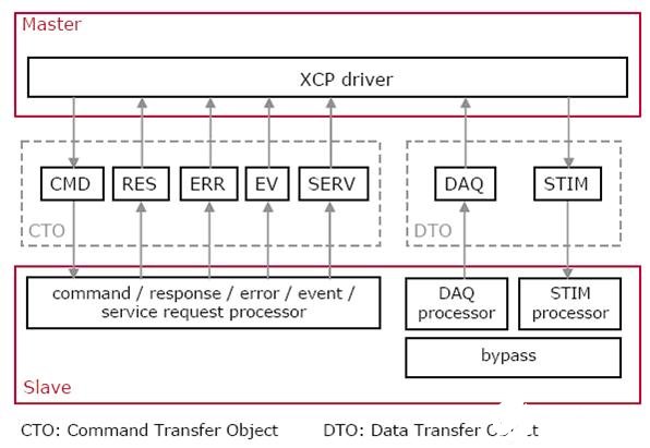 XCP通信使用“命令传输对象”(CTO)和“数据传输对象” (DTO)来区分(主从通信)。XCP主设备可以在总线上向ECU通过CTO发送命令。ECU会在执行完请求的服务后以同样的途径进行应答。CTO会提供:CMD(命令), RES (响应), ERR (错误), EV (事件) 和 SERV (服务请求处理机)。数据传输对象DAQ(数据采集)和STIM(激励)用于以事件驱动方式从内存中读取测量变量或者向XCP从设备的内存中写入变量值。