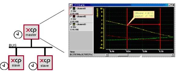 XCP主设备接收带有时戳的数据并且将其保存在相应的测量文件中。时戳要么通过XCP从设备作为数据发送,要么分配到消息中通过硬件接口(比如CANcardXL)发送。在测量文件中,所有数据参考XCP主设备的时间基准进行同步,然后被进一步处理,例如在一个统一的时间轴上对测量数据进行可视化显示(图5)。这就允许在一张图中一致地显示不同XCP从设备的多个数据通道。