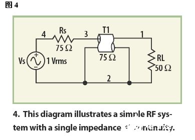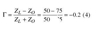 为了更好的理解VSWR,我们不妨以图4中的系统为例。假设源端发出的功率恒定不变。反射回源端的信号功率的增加将会导致到达负载端信号功率的相应减少。当在75-W的同轴电缆上传输的信号波遇到50-W的终端时,由于元件阻抗的不匹配就会导致出现反射现象。在计算这一例子的VSWR之前,我们需要首先计算出反射系数(Γ):