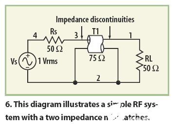 总的传输线损耗通常等于导线上的功率损耗(也称为传导损耗或电阻损耗)和系统内阻抗失配引起反射导致的损耗。在如图6所示的射频系统中,50-W的源和负载通过一条1m、75-W的同轴电缆连接在一起。在这个例子中,总的功率反射是由两个阻抗不连续点导致的,第一个点位于源和传输线之间,第二个点位于传输线和负载之间。