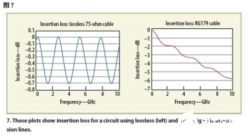 即使假设图6中的传输线是无损的,图7中左边的图表示介入损耗也多达0.7dB,这一损耗仅仅是由系统中的阻抗不连续而造成的。该图中波峰和波谷之间的距离主要取决于所用线缆的长度。图7中右边的图假设传输线有一定的传导和电阻损耗。该图中曲线的斜率表示该线缆的传导和介电损耗,而曲线的波纹是由于回波损耗随频率的变化而造成的(在这个例子中多达0.7dB)。