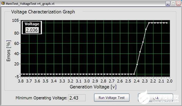 采用数字仪器,如NI 6552数字波形发生器/分析仪,工程师可执行存储器件全部特征的提取,而无需增加额外的测试设备。采用NI LabVIEW这样的软件,工程师能够创建一个测试,扫描用于与存储器件通信的电平以验证最小工作电压。图3所示在LabVIEW中这种测试的结果。其中,水平轴表示被测电压,垂直轴表示接收到的错误位百分比。从图中很容易推出存储器件的最小工作电压为2.43V。