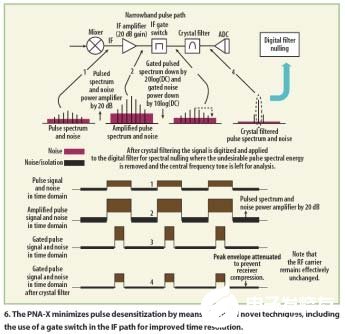 PNA-X采用了新的硬件和软件技术/算法,大大改善了这种局限性,这种技术/算法可充分减小20log(占空比)的脉冲减敏。两个主要进步是增强的硬件选通和软件选通。为改进PNA-X的时间分辨率,在IF路径上加入了选通开关(图6)。选通开关接收其中一个脉冲发生器输出通道的时序,此输出通道设置脉冲周期、宽度和延迟。选通开关的宽度提供脉冲内取点及脉冲成形测量的时间分辨率。