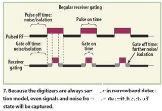 窄带检波模式是一种异步脉冲测量,其中数字转换器在连续测量信号的同时,分析仪在处理所有数字化信息。这就意味着即使选通开关关闭,仍在进行数据采样和处理(图7)。IF选通开关在关闭状态下的任何残留谱隔离和噪声都是不希望的,因为真正感兴趣的是在选通开关打开时所发生的情况。在理想情况下,完美的选通开关在关闭状态没有信号或噪声,以避免数字化额外噪声,否则,这种额外噪声会增加测量噪声,降低测量结果的精度。