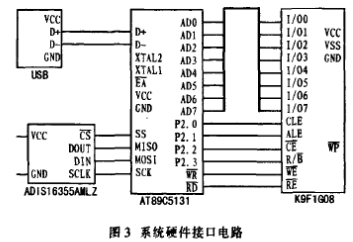 该系统的硬件电路部分主要由内置USB控制器的AT89C513l、NAND Flash器件K9F1G08UOM电路以及ADISl6355AMLZ组成,硬件接口如图3所示。必须写入相应的命令才能顺利执行ADISl6355AMLZ和NAND Flash的各种操作,南于数据线与地址线复用为8根线,因此地址、命令以及数据的输入/输出需要通过命令锁存信号(CLE)和地址锁存信号(ALE)共同控制从分时复用。